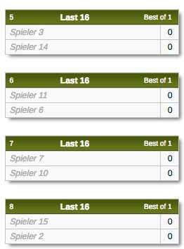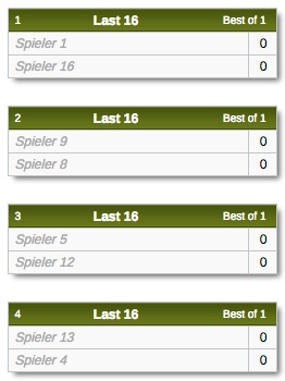 Die Nummern 1 und 2 werden in die Felder „Spieler 1” bzw. „Spieler 2” gesetzt, die Nummern 3 bis 8 werden in der Reihenfolge, die der Zufallsgenerator vorgibt, in den Raster gesetzt, und zwar der Reihe nach in die Felder „Spieler 3“ bis „Spieler 8“. Dann folgen die Nummern 9 bis 16, die in die Felder „Spieler 9“ bis „Spieler 16“ laut unten stehender Grafik gelost werden.