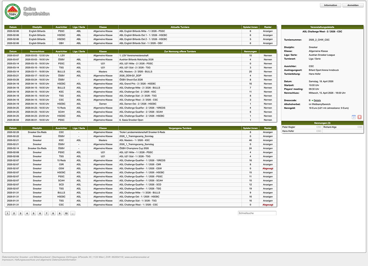 Über die Online-Sportdirektion verwaltet der Österreichische Snooker- und Billiardsverband seine sportlichen Aktivitäten.